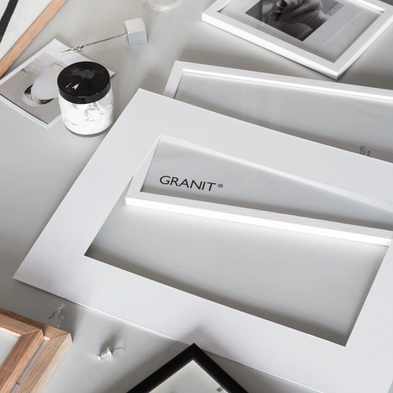 Holzrahmen aus lackiertem Kiefernholz und Rückwand aus MDF mit Echtglasplatte.