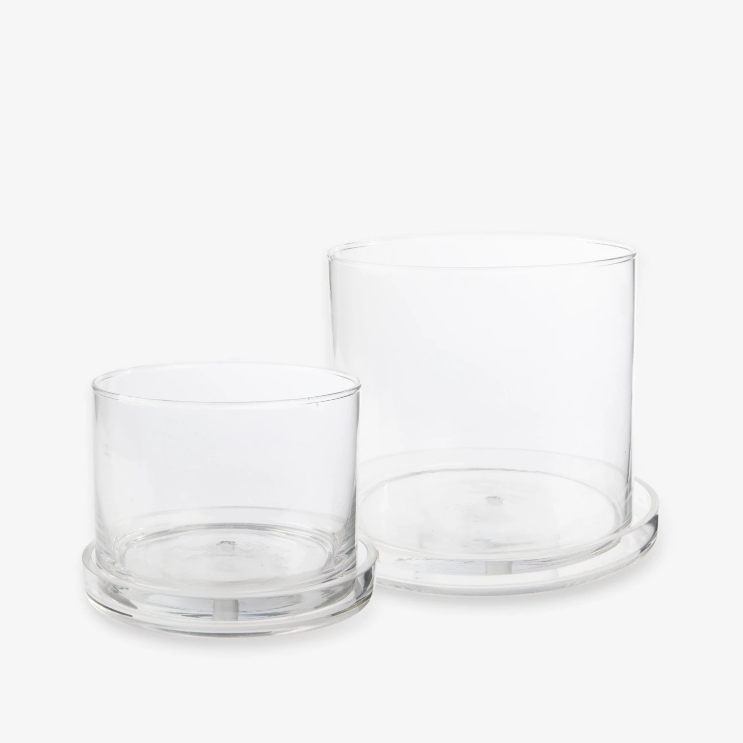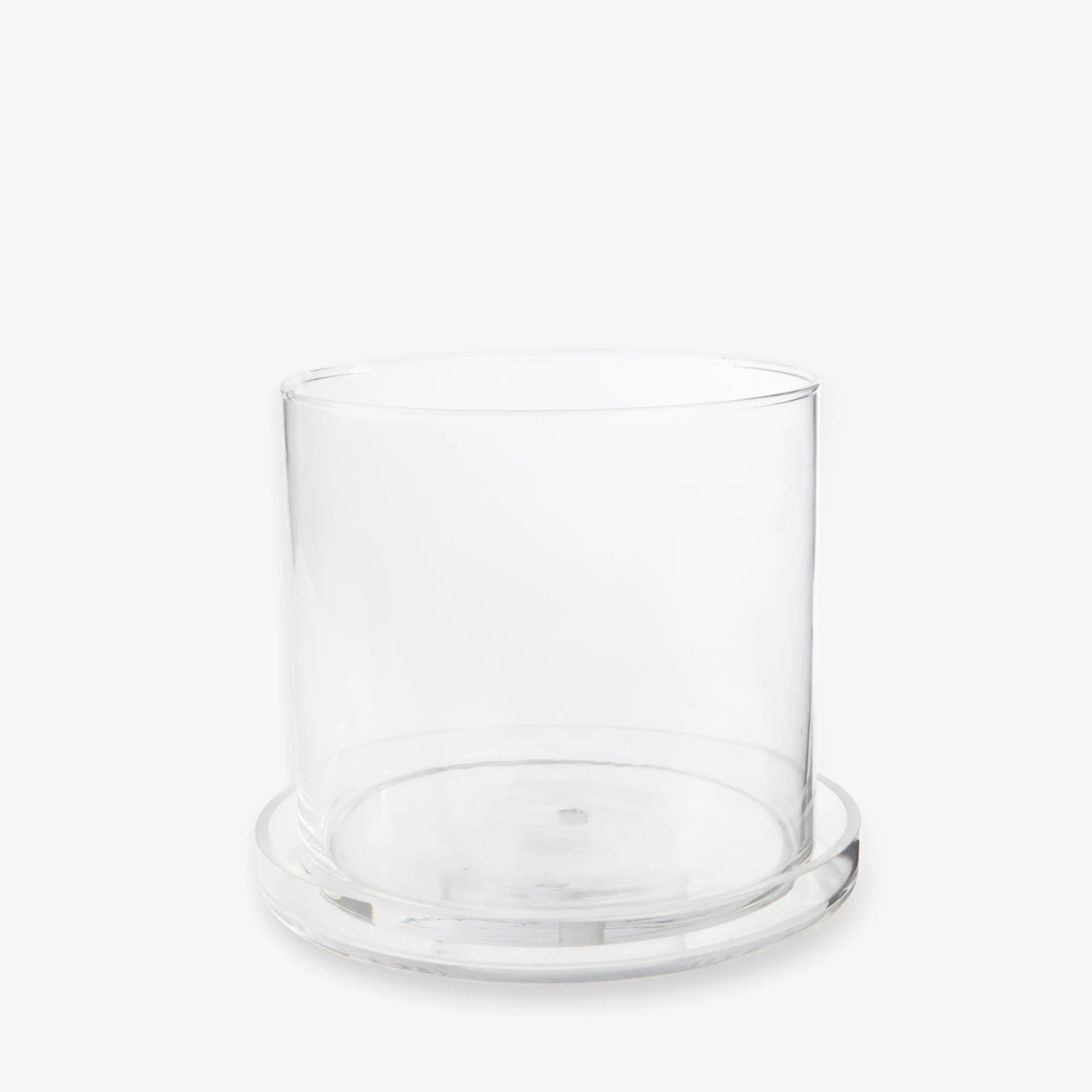 Glasgefäß mit Untersetzer, zylindrisch, groß.