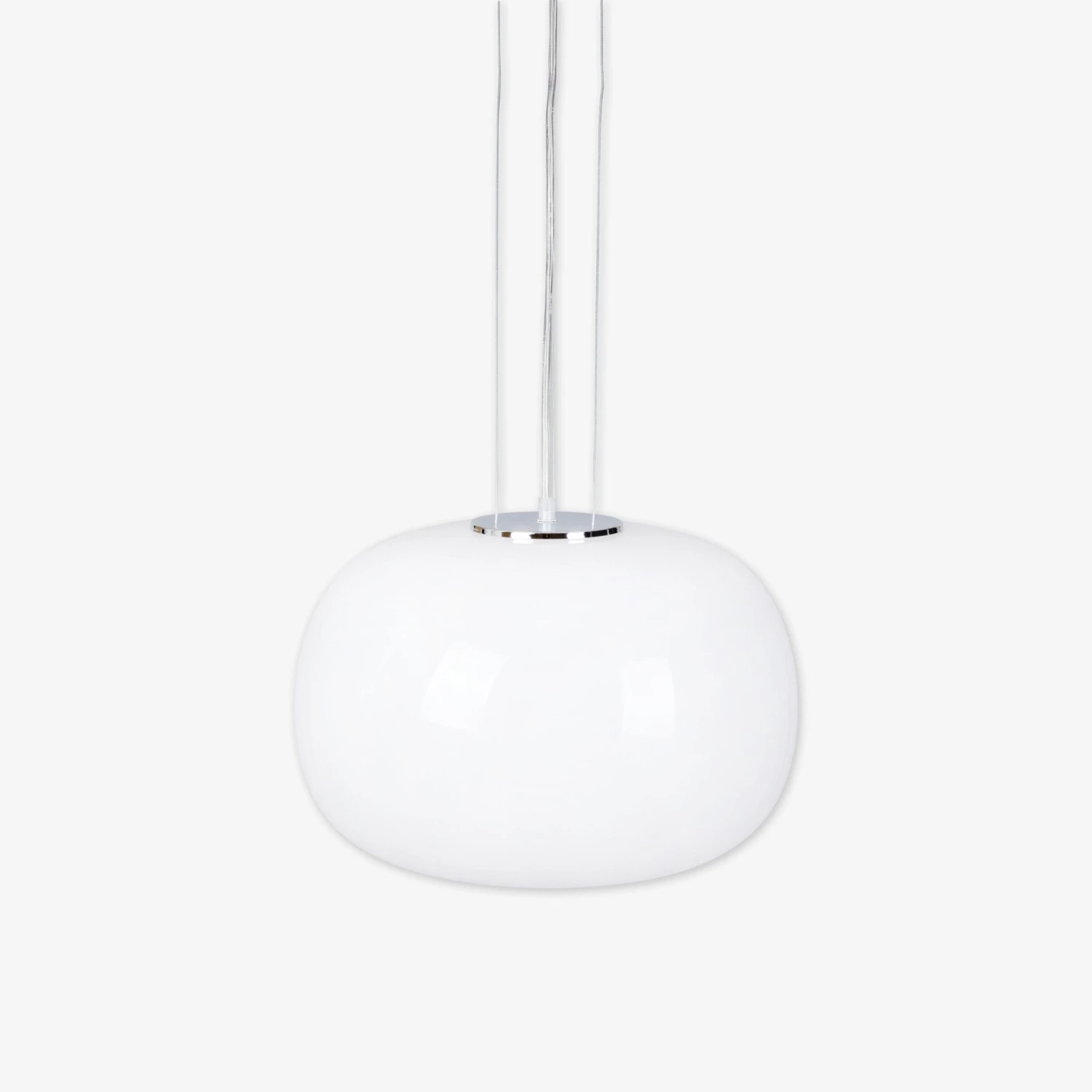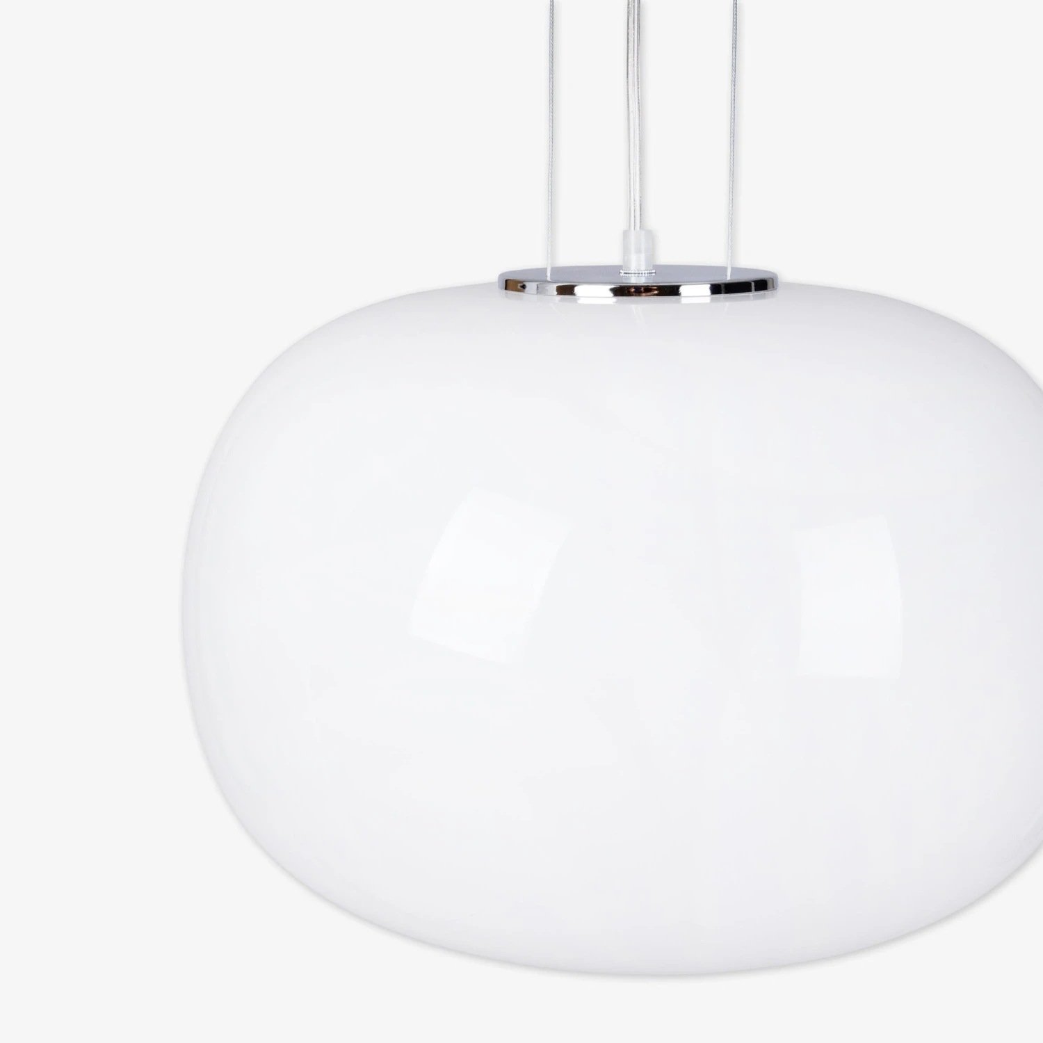 Ästhetische und stilvolle Deckenleuchte mit weißem Opalglasdiffusor und verchromten Metalldetails. Die Lampe hat ein transparentes Kabel von 120 cm und 3 verchromte Metalldrähte und einen verchromten Deckenschirm, inklusive Verbindungsstift. Lichtquelle und Deckenanschluss sind separat erhältlich.