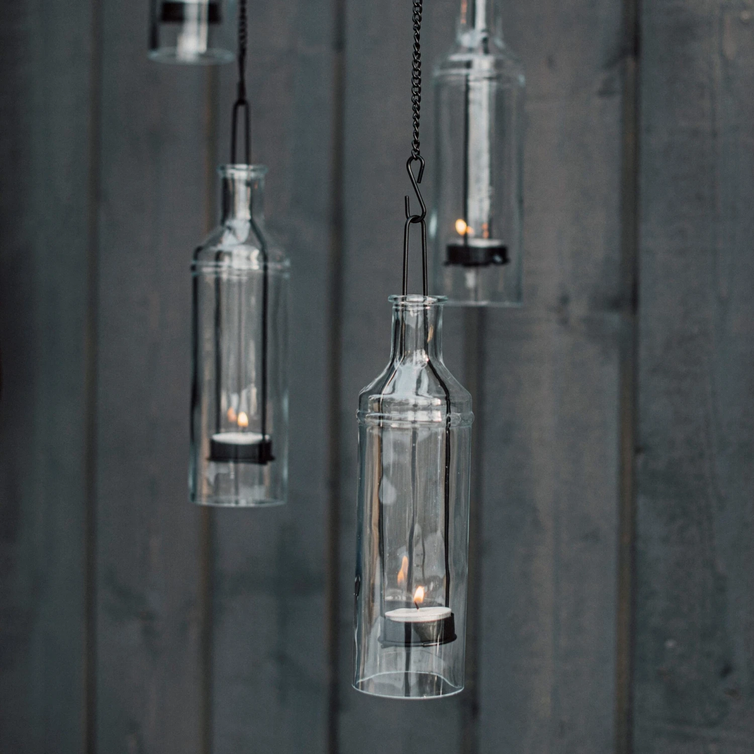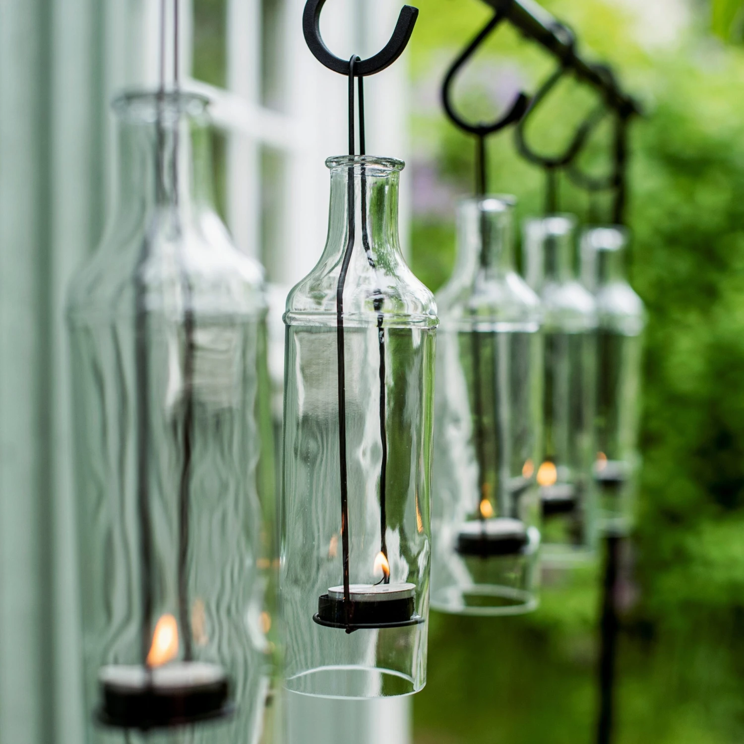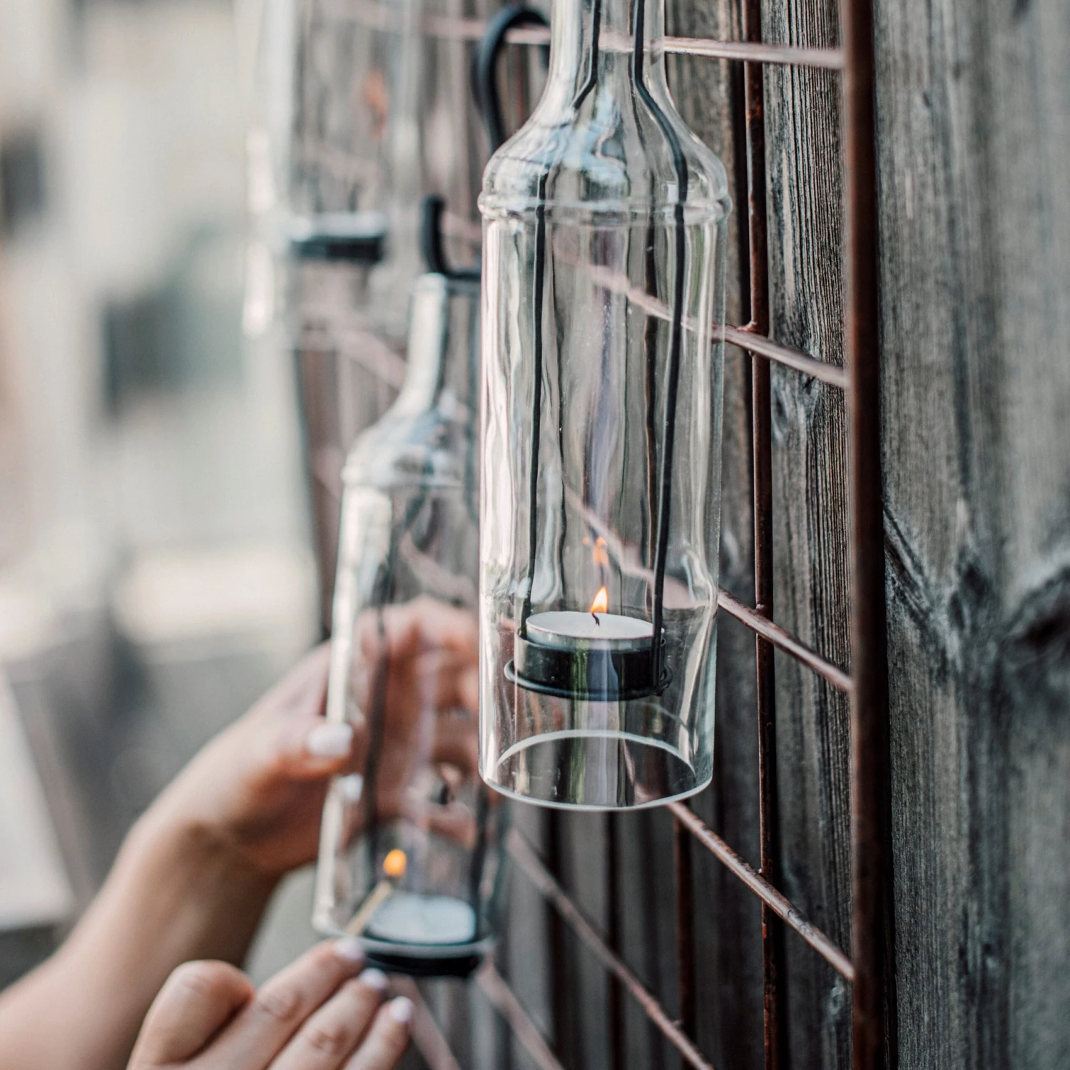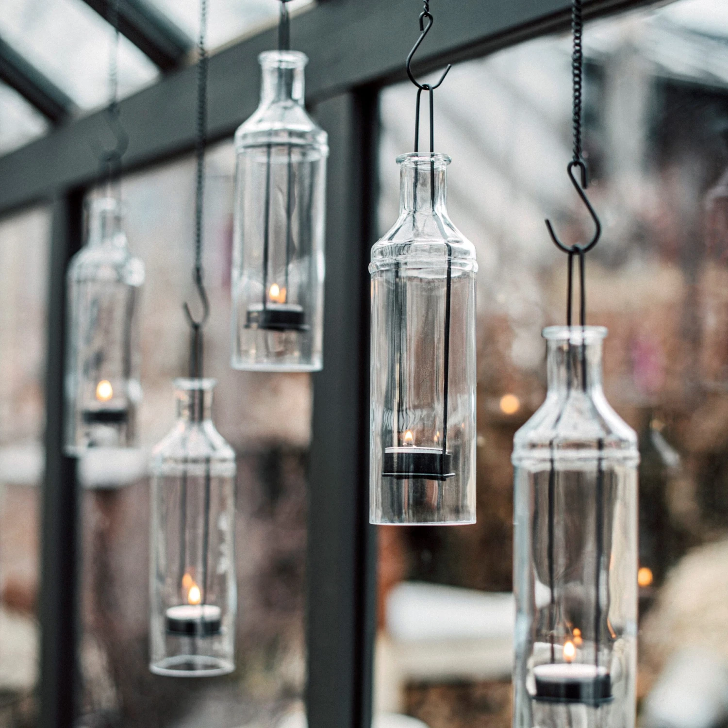 Die Hängelaterne mit Metallhalterung für ein Teelicht sorgt für ein angenehmes und gemütliches Licht. Damit die Kerze Sauerstoff erhalten und brennen kann, muss die Laterne aufgehängt werden. Passende Ketten zum Aufhängen findest du ebenfalls in unserem Sortiment.