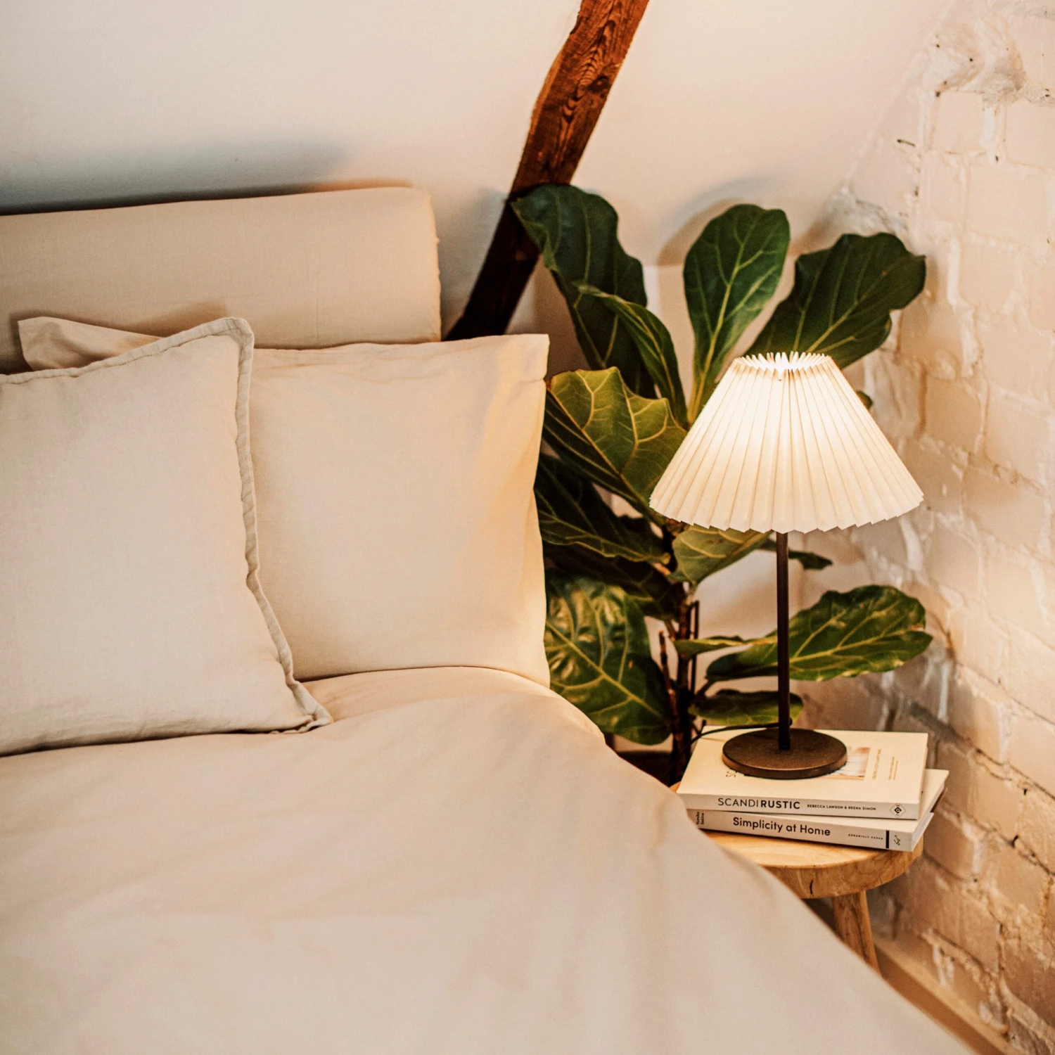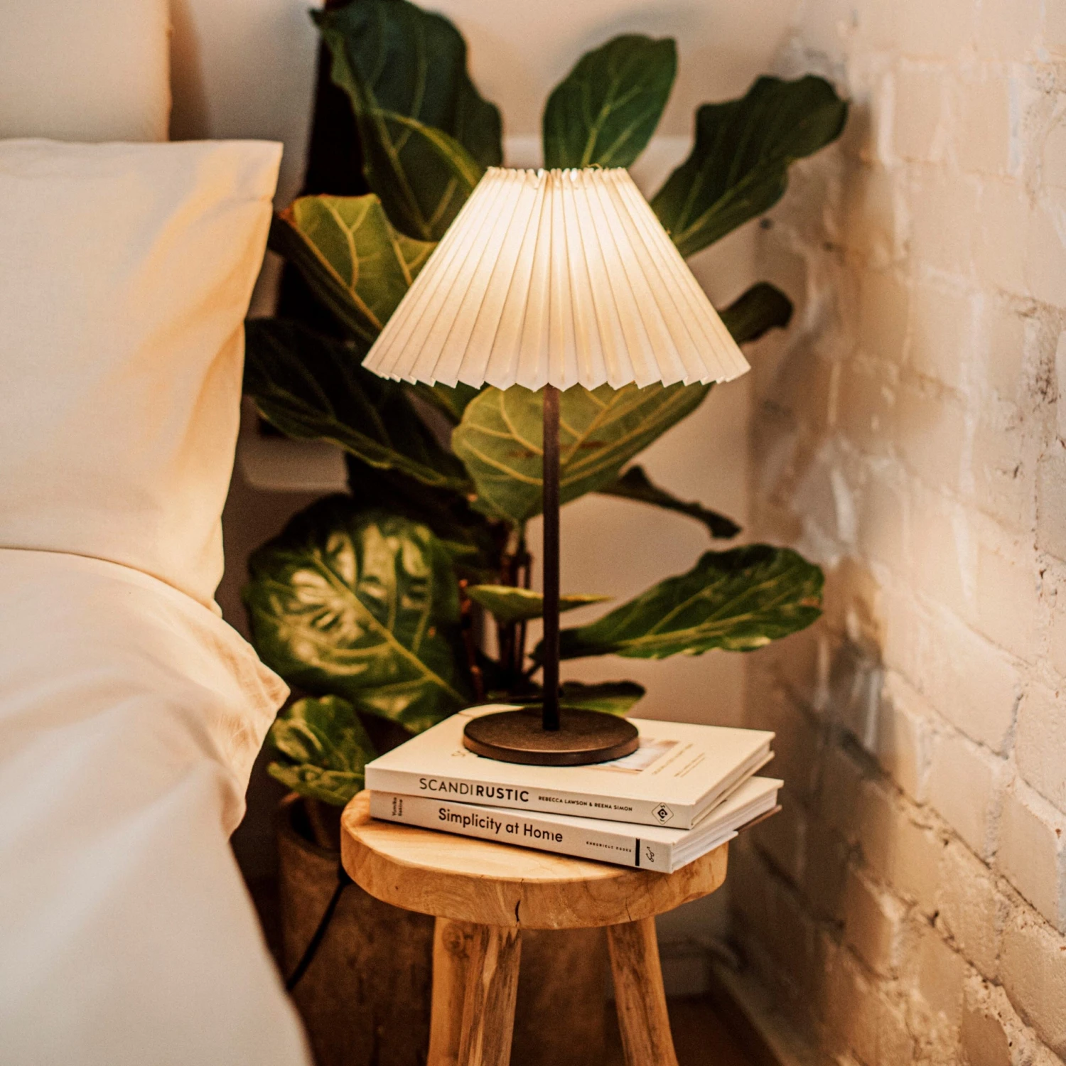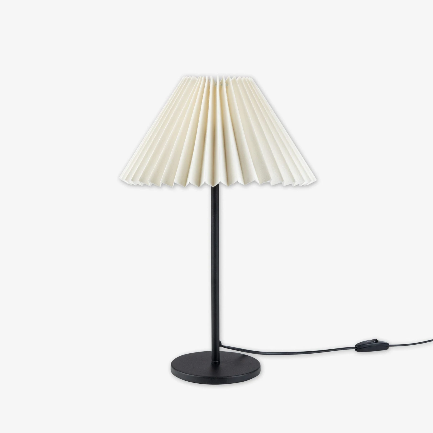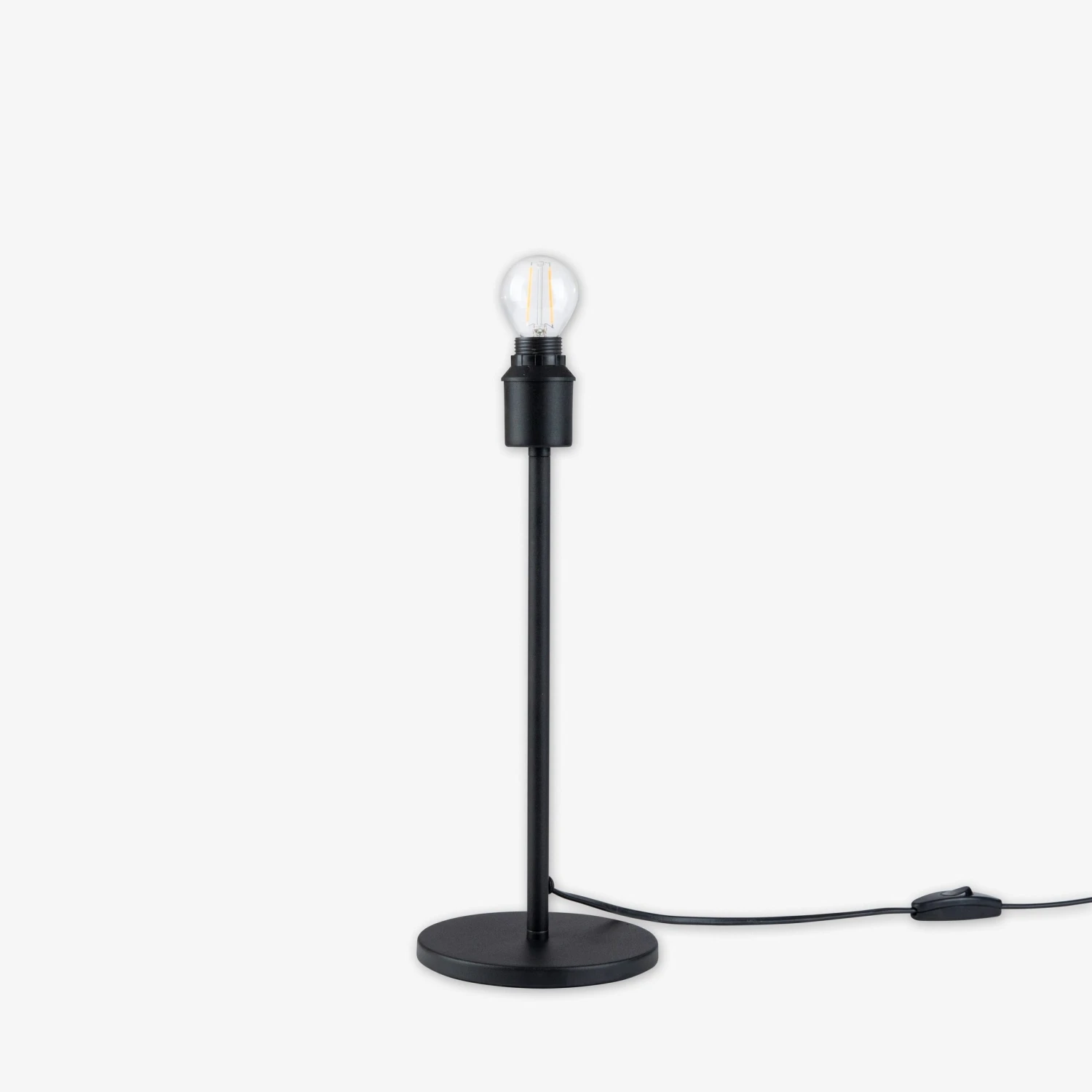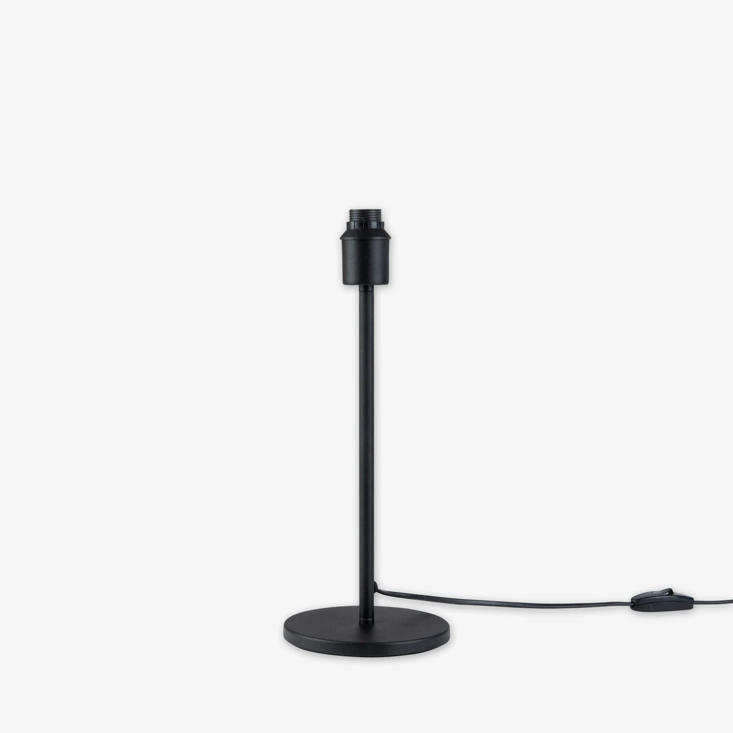 Eleganter, schlichter Lampenfuß aus schwarzem Metall mit schwarzem Kabel und Schalter. Sockel E14.