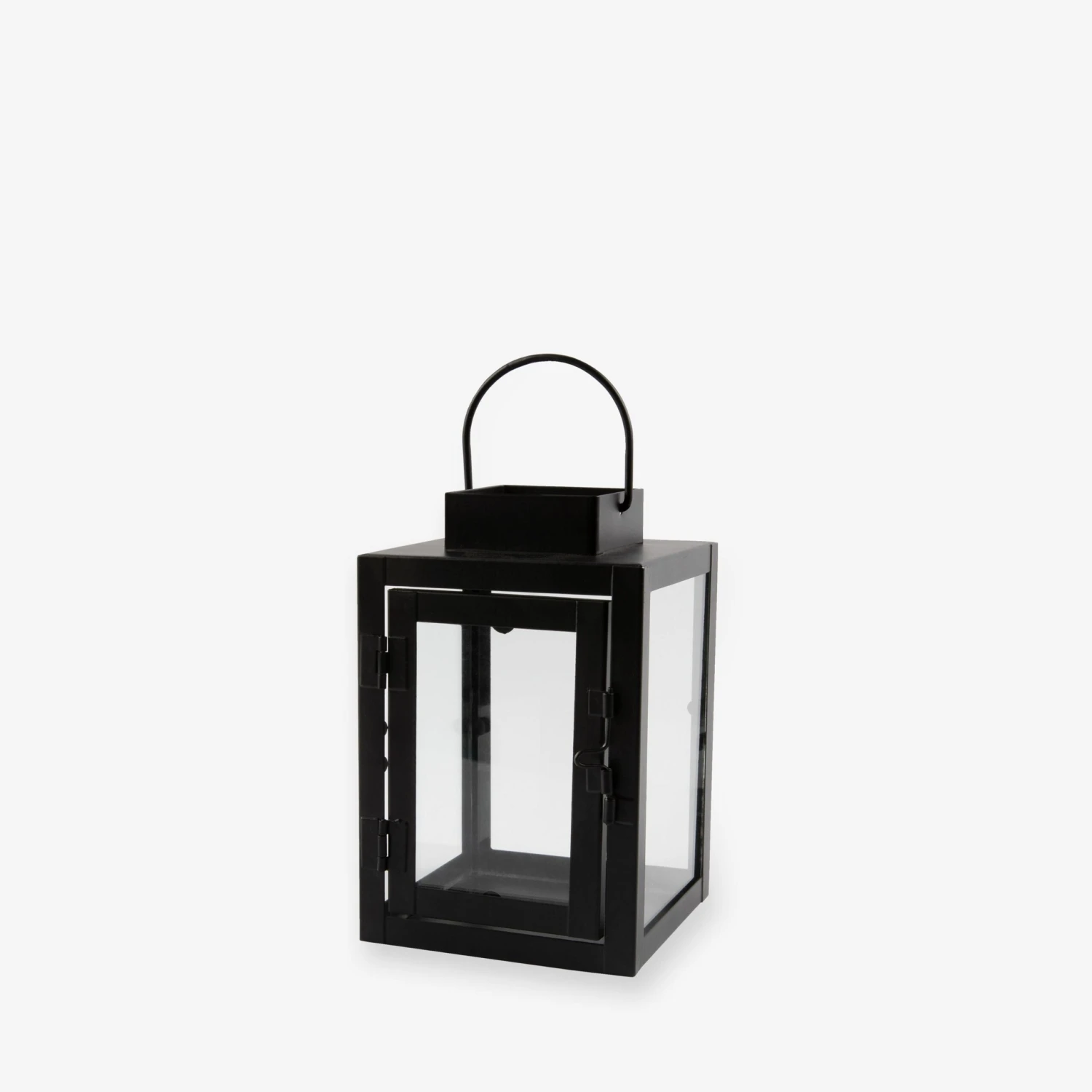 Schwarze Metalllaterne mit Glastür, die sich mit einem kleinen Haken öffnen und schließen lässt.