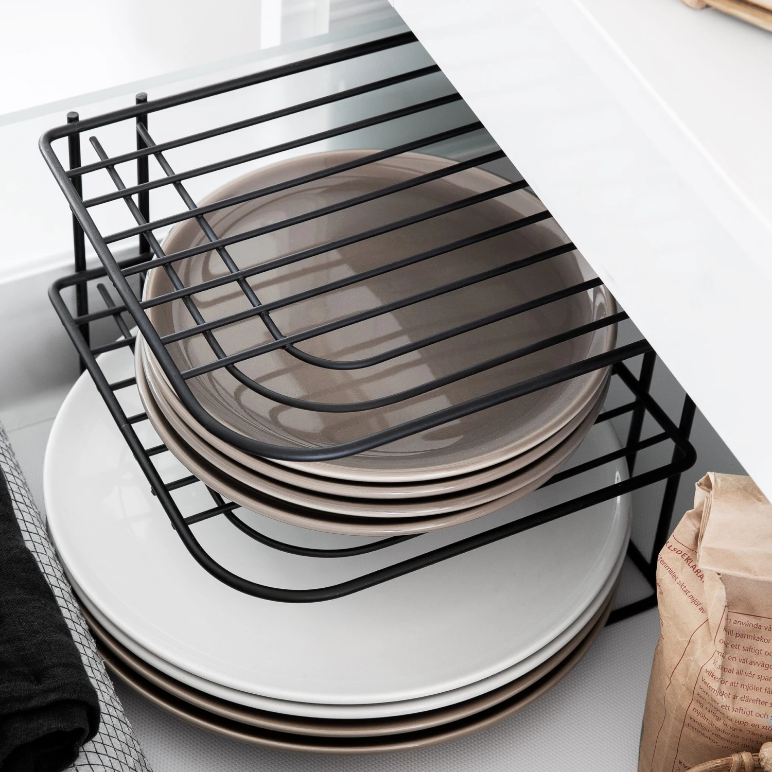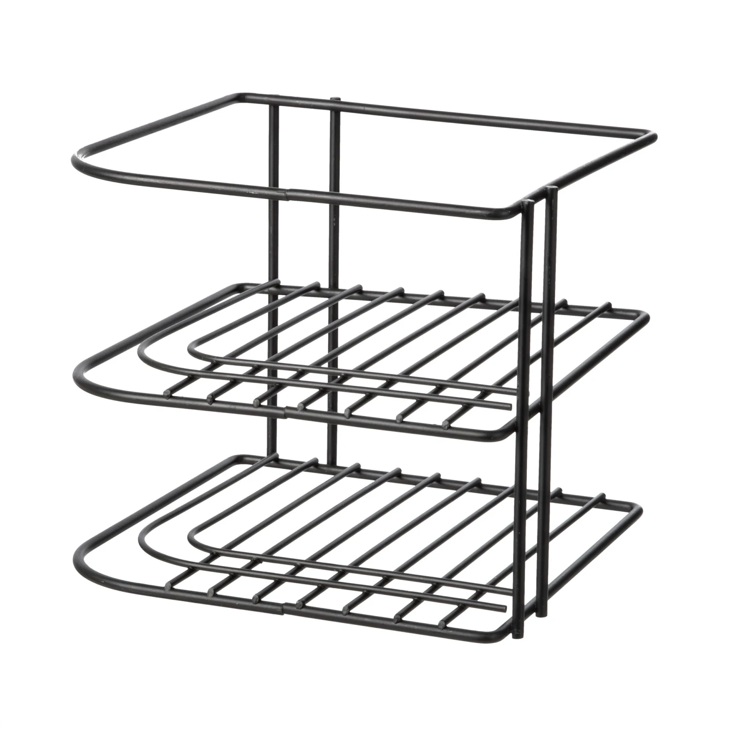 Schwarzes pulverbeschichtetes Regal mit zwei Ebenen. Durch das clevere Design passt das Regal perfekt in die Ecke eines Schranks, einer Bank oder eines Regals. So schaffst du noch mehr Stauraum in z.B. Küche oder Badezimmer.