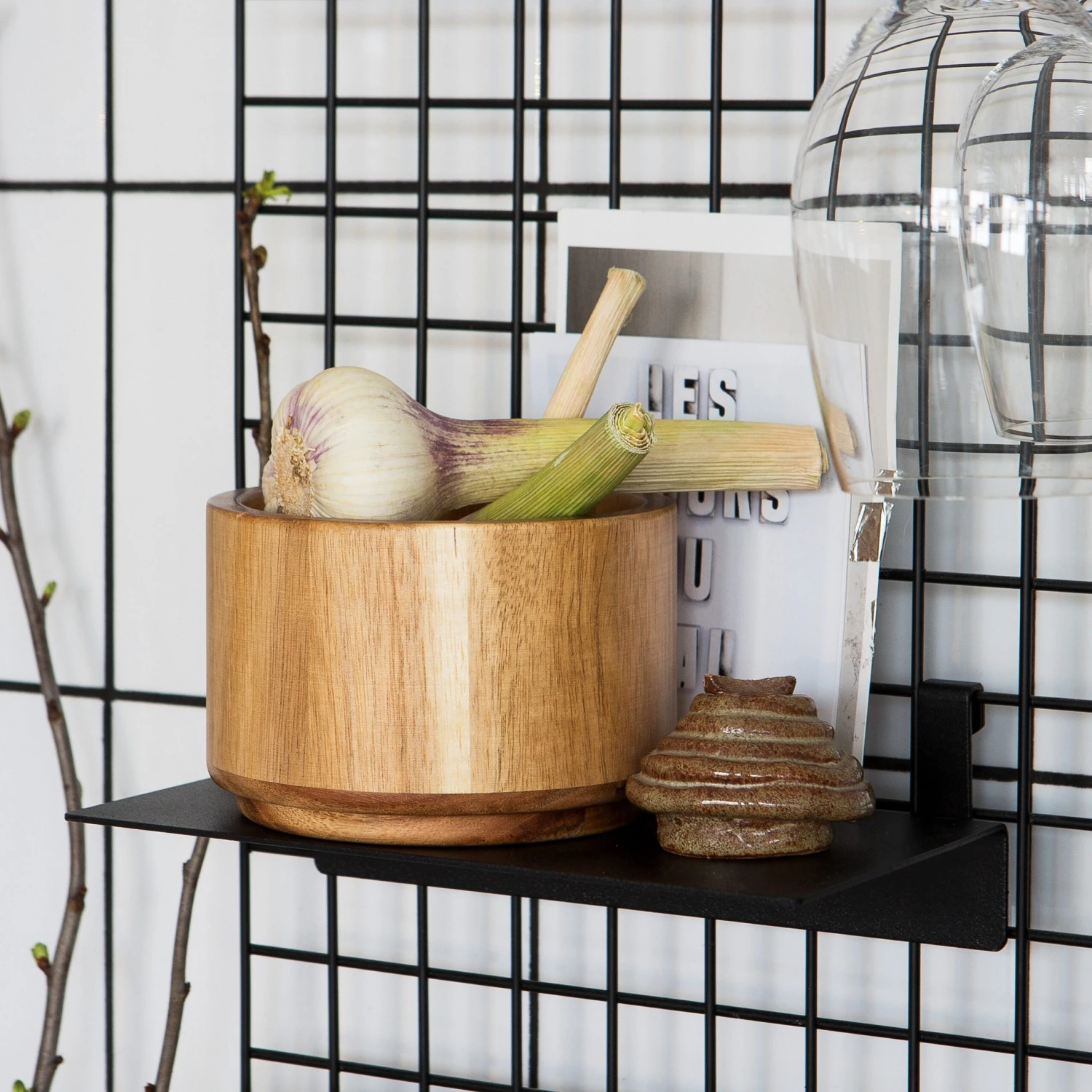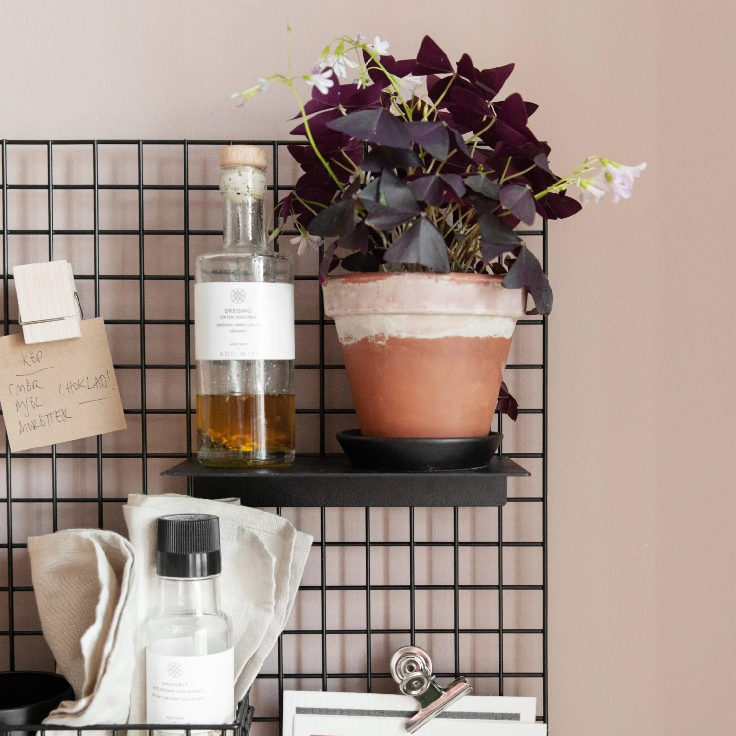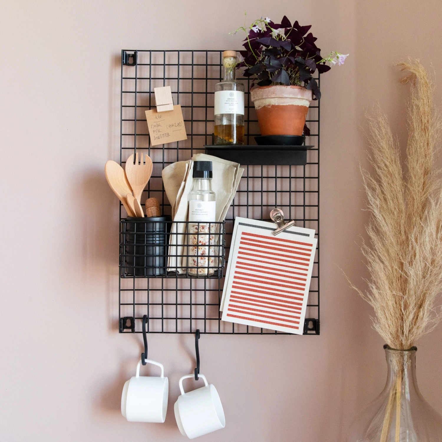 Kleines praktisches Regal mit zwei Haken auf der einen Langseite, das du an unsere Aufbewahrungsgitter hängen kannst.