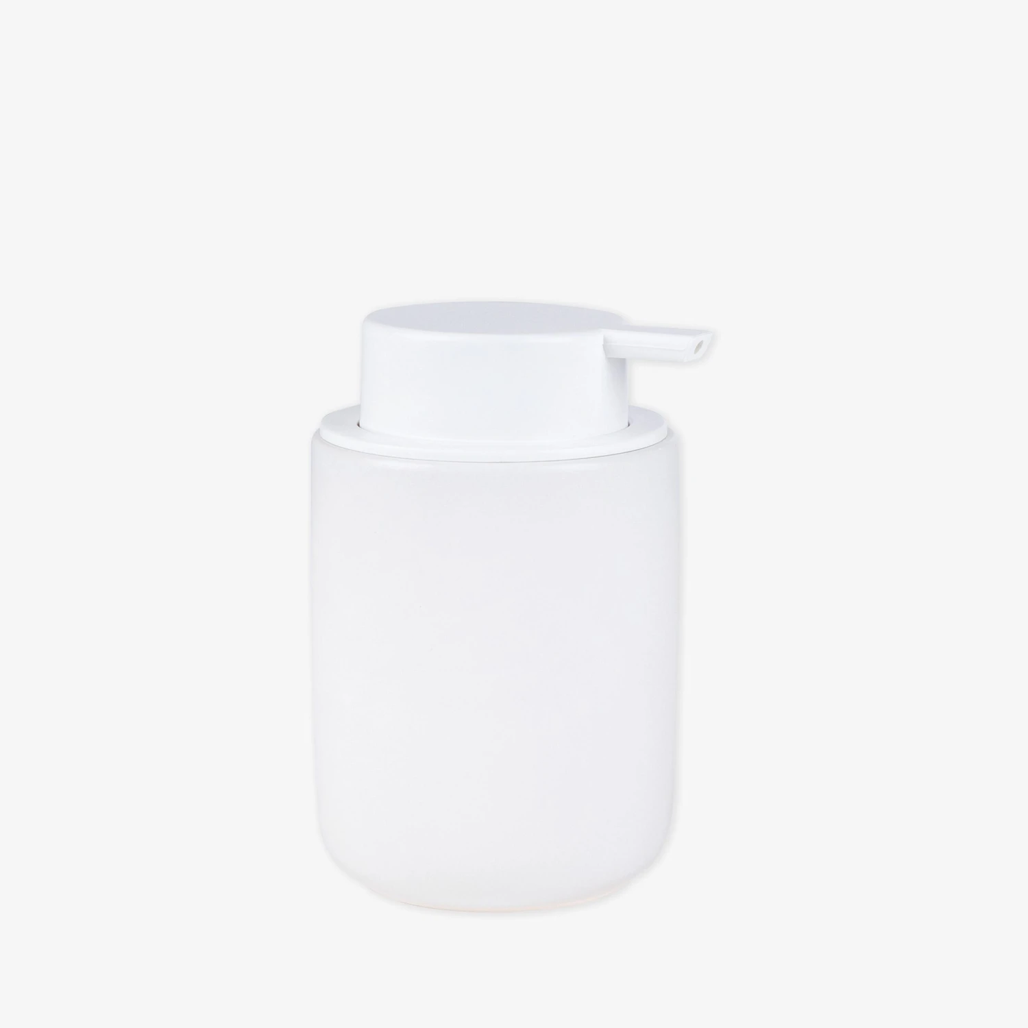 Stilvoller Seifenspender aus mattweißem Dolomitstein mit praktischer Kunststoffpumpe. Die Seifenpumpe kann mit einer Toilettenbürste und einem Zahnputzbecher aus demselben Material kombiniert werden. Auch in schwarz erhältlich.