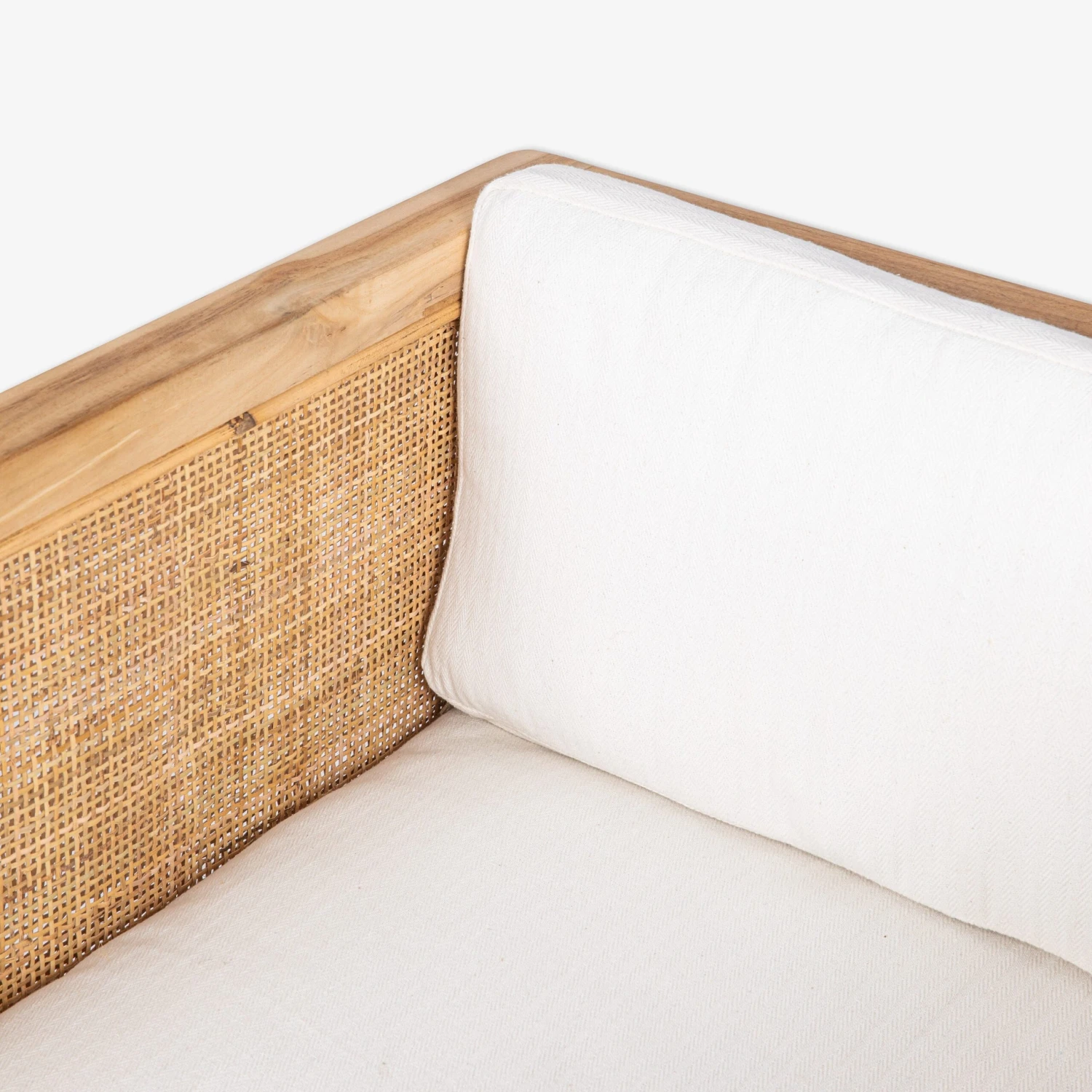 Schöner und stilvoller Sessel aus Teakholz und Rattan mit einem passenden weißen Kissen. Funktioniert sowohl im Wohnzimmer als auch im Schlafzimmer. Nur zur Verwendung in Innenräumen. Höchstgewicht: 120 kg.