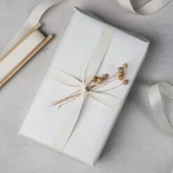 Mit Hilfe unseres weißen Textilbandes kannst du tolle und einzigartige Verpackungen gestalten. Es besteht aus Polyester und lässt sich perfekt mit unserem gewachsten Geschenkpapier kombinieren.Länge: 7 m und Breite: 1,5 cm.