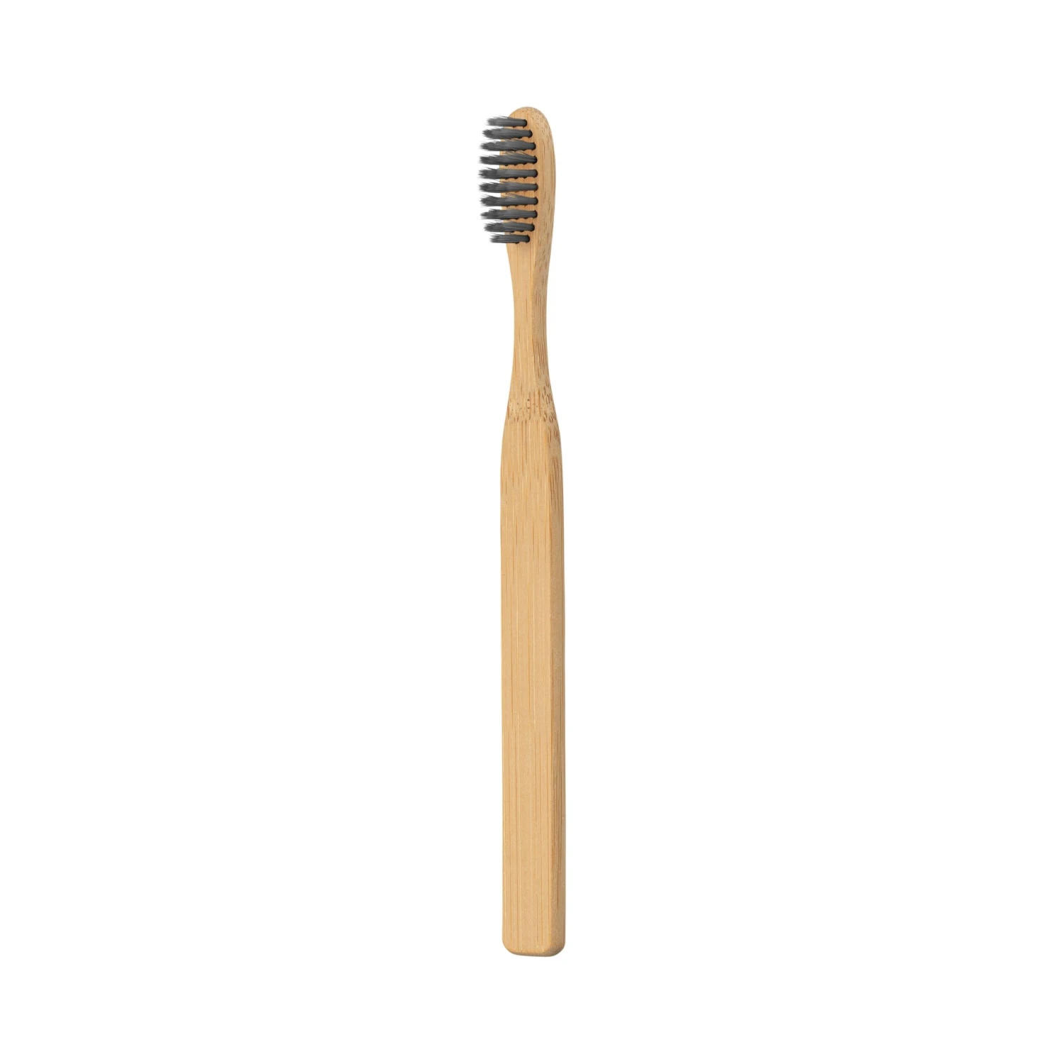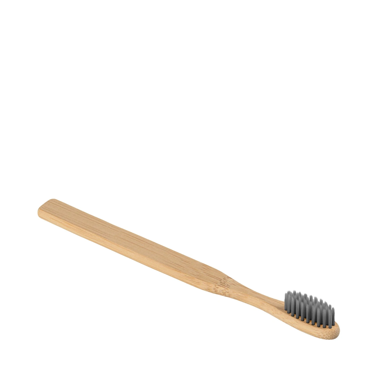 Toothbrush with a shaft made out of bamboo and a grey brush made out of charcoal-fibers.